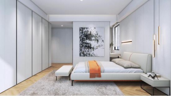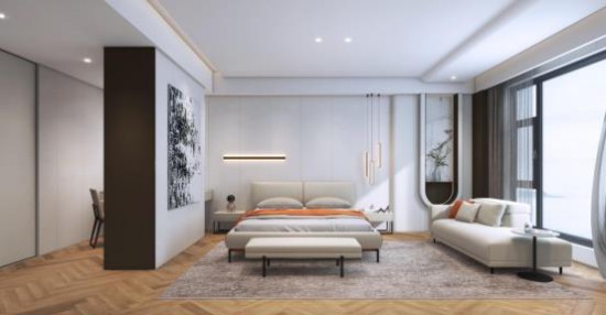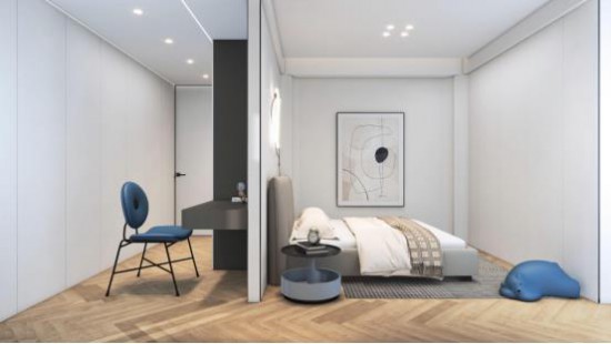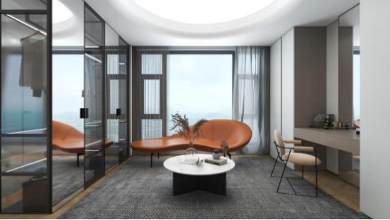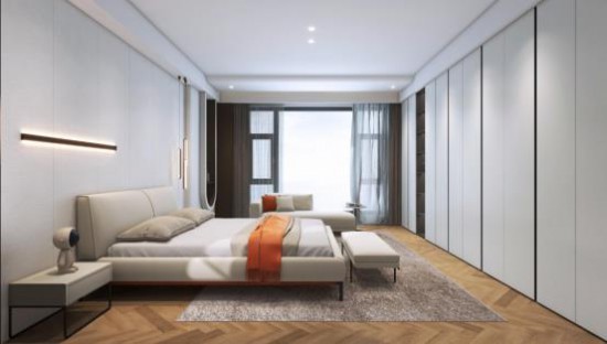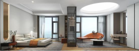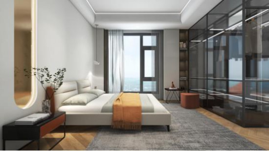 完美利用大平层的优势,主卧依据比例分割 天堂视频,间以灰色透明玻璃柜隔断,光影朦胧中感受空间的虚实写意。