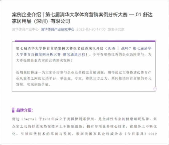 2023年3月,舒达床垫成功入选2023年第七届清华大学体育营销案例分析大赛案例企业,舒达与TEAM CHINA中国国家队,奥运冠军徐梦桃的体育营销实践 天堂视频,成功入选中国顶尖学府的重要研究课题,3月30日舒达床垫获得主办方清华体育产业研究中心官方公众号首例推荐。