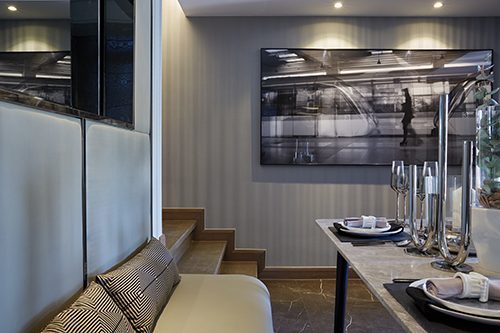 次客厅位于楼梯口,高级灰的墙面硬包及壁纸铺陈了整个空间的基本基调。金属分隔条的运用则修饰界定了各个空间,木纹石电视机墙面与之相呼应,打破了空间的沉闷。