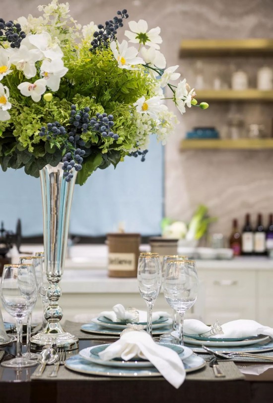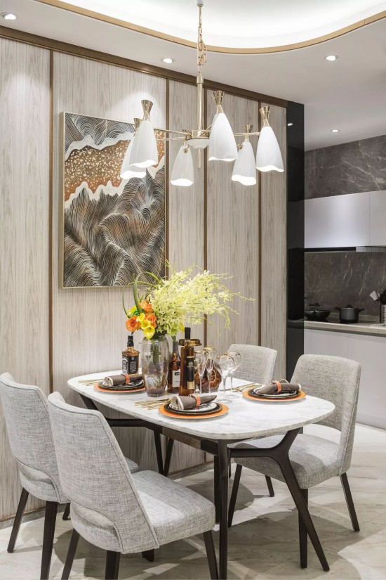 软装打破了传统的定式,迎合年轻一代的思维,舍弃笨重无用的家电,加以色彩斑斓的无框抽象画作与温婉的花枝缀之,将空间化身为一场艺术的宴席。布艺与皮革在别致灯具的衬托下,与云石台面相映相称,有如艺术品般,点缀空间的浪漫香氛,给予了空间更多的想象艺术。一种简约低调的奢华、一种高级雅正的美悄然降临期间。