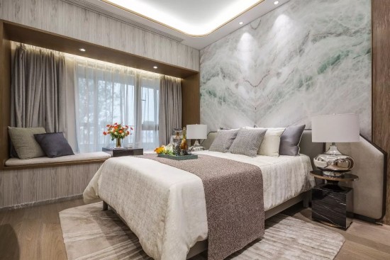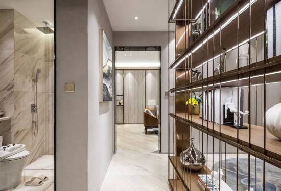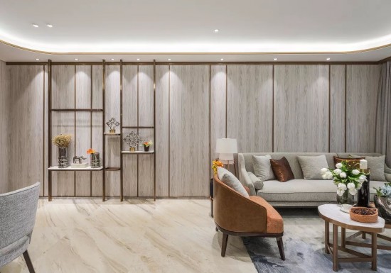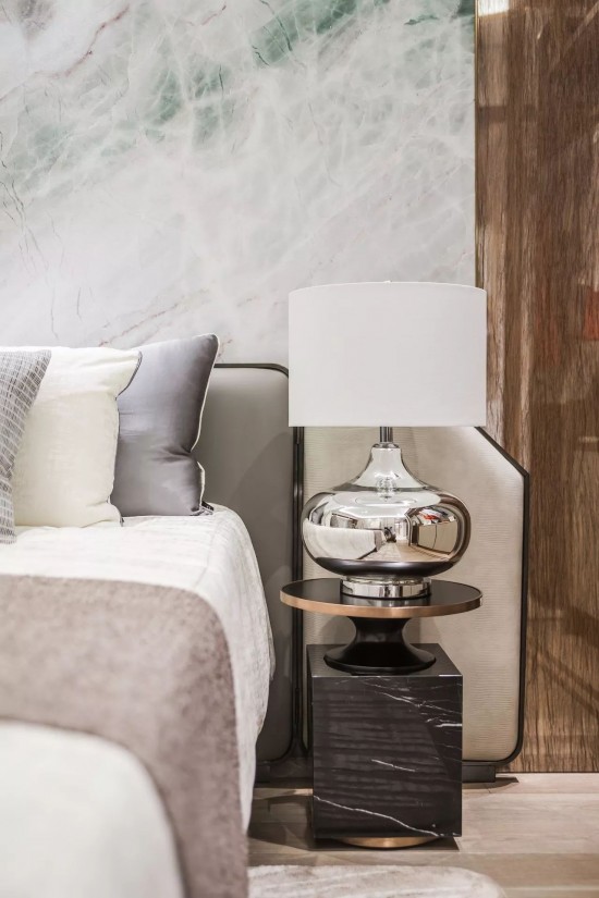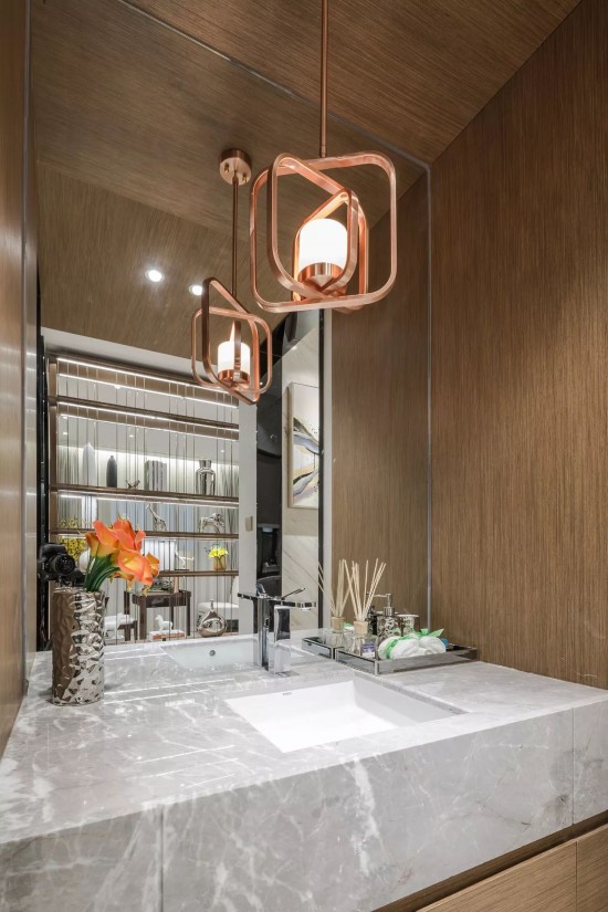质感石材、高级皮质、镜面玻璃与钛金等不同材质灵活贯穿其中,将港式风格独有的时尚与璀璨从本质上突显出来,深浅结合的硬包沙发,围合出生活的品质感。