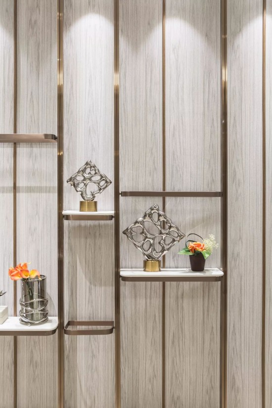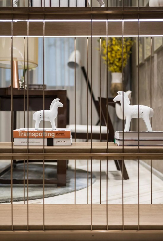 在方正、直线条穿插的空间中,带有金箔赋色的装饰画,则以抽象、柔美的线条延伸出更具想象力的意蕴,也宣扬着现代人对多种生活趣味的热爱。